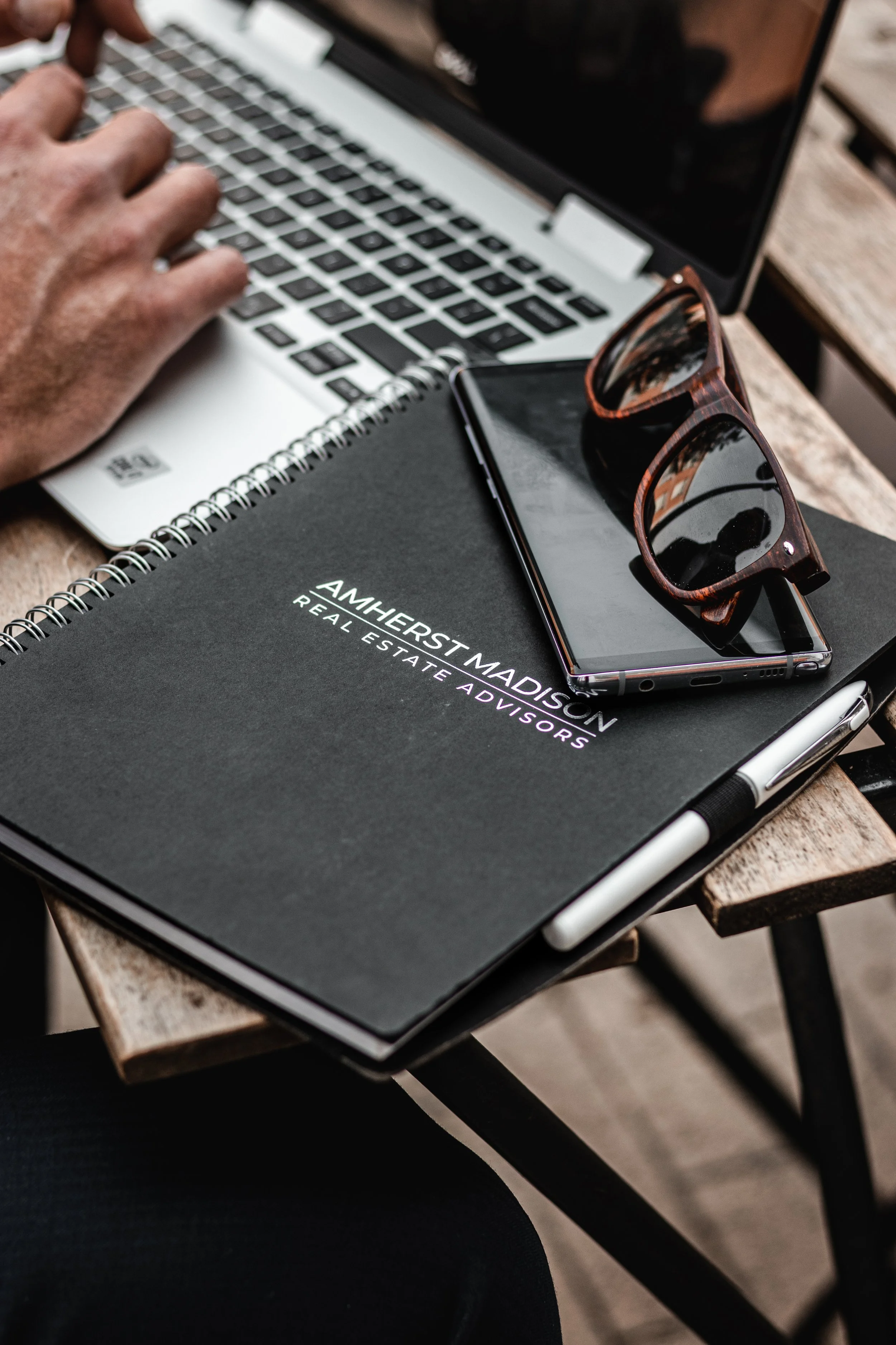 A workspace with a person working on a laptop, a notebook labeled 'Amherst Madison Real Estate Advisors,' sunglasses, a smartphone, and a pen on a wooden table.