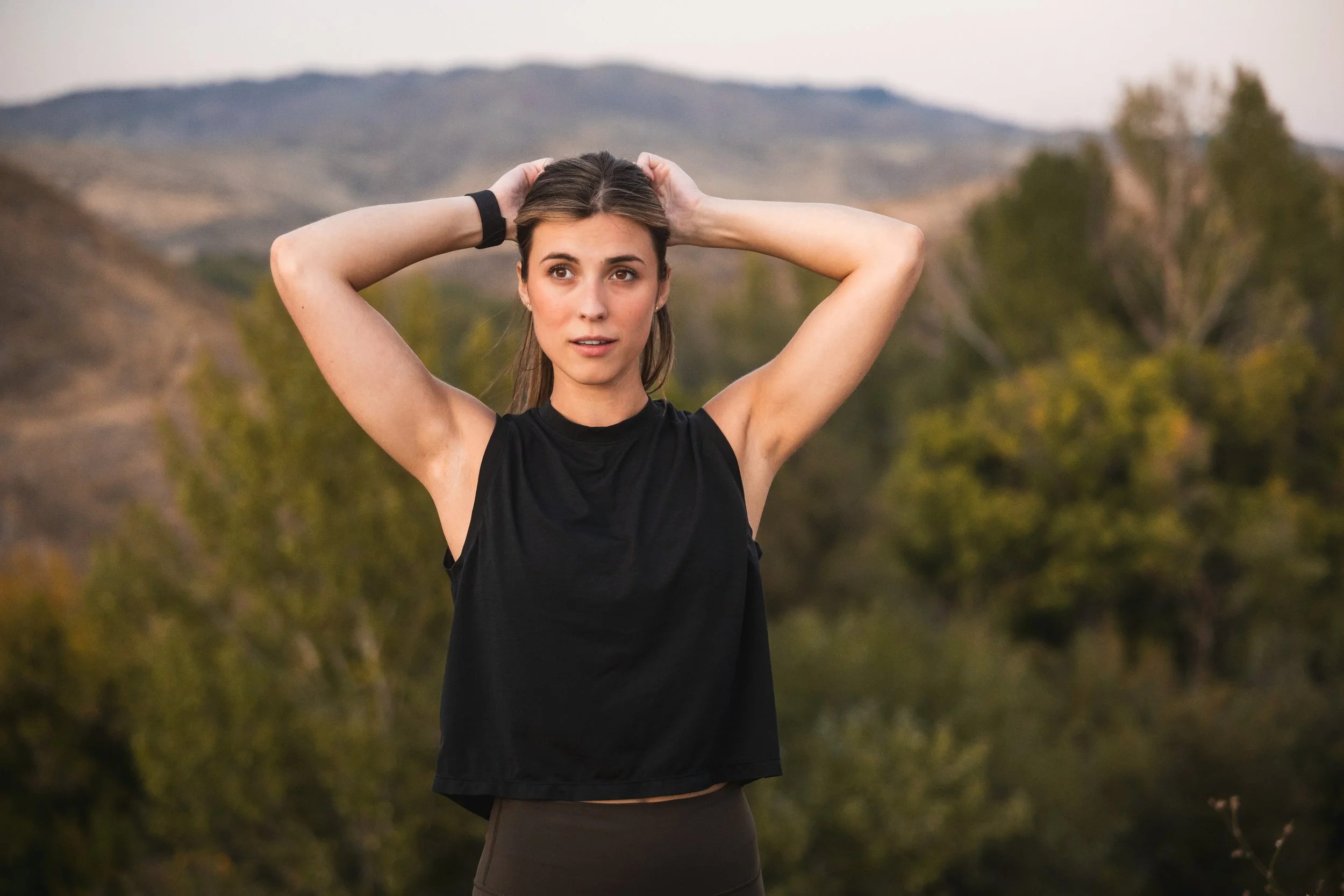 A woman standing outdoors with her hands behind her head, wearing a black sleeveless top, with trees and mountains in the background.
